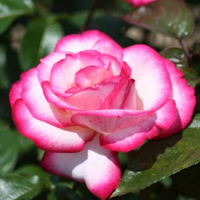 Одним из главных достоинств розы является ее яркая и насыщенная окраска цветков. Белые, розовые или бело-розовые лепестки создают эффектный контраст с карминной каймой. Крупные цветки диаметром от 10 до 12 сантиметров имеют умеренную махровость и состоят из 17-25 лепестков.